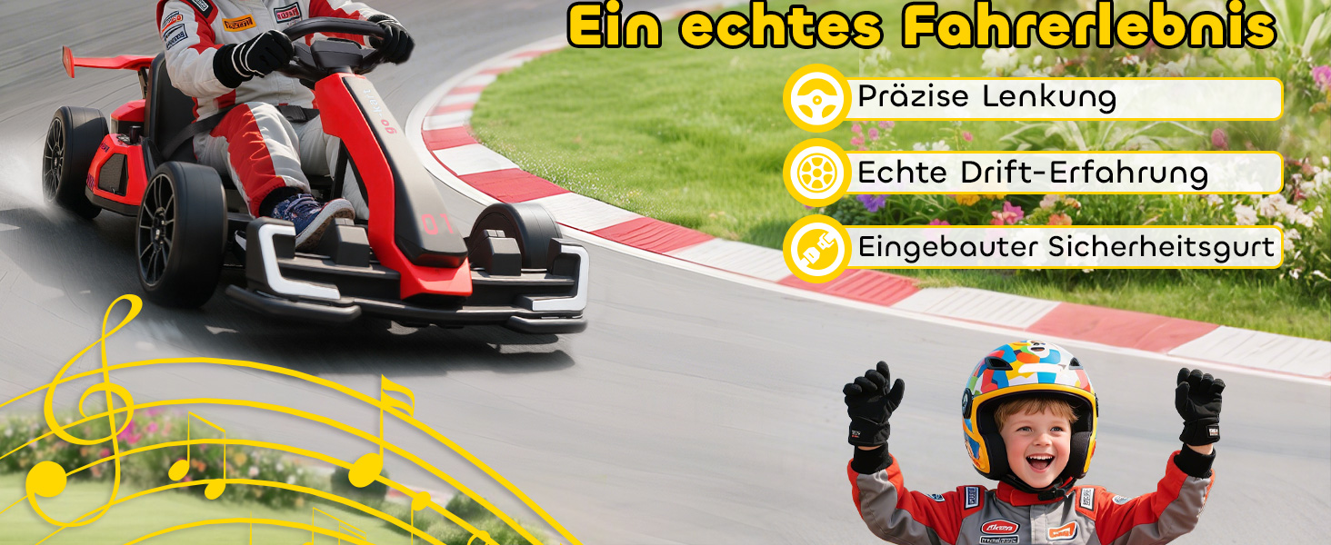 This electric drift go-kart features a powerful 24V dual-drive motor, allowing kids to easily accelerate or brake using the foot pedals. With a top speed of up to 12 km/h, children can enjoy an exciting yet controlled driving experience.